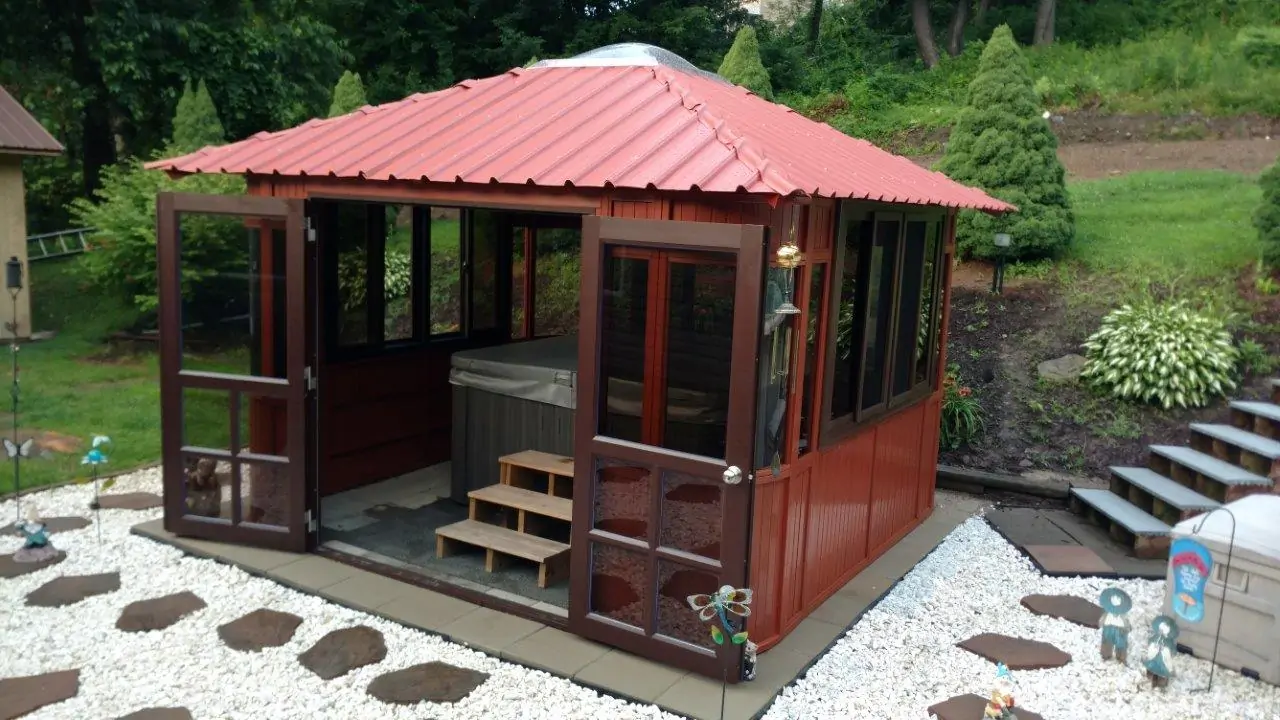 - Spacious Design: The Aspen 12×12 is large enough to house a 7- or 8-foot hot tub with room for steps and a small sofa to relax around the hot tub. The spacious design also allows for several other applications such as a garden office or exercise space.