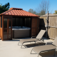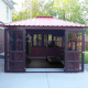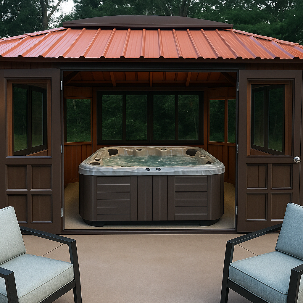 The Aspen 12×14 hot tub enclosure provides room for an 8-foot square spa with room for steps, a table and chairs to relax around a hot tub.