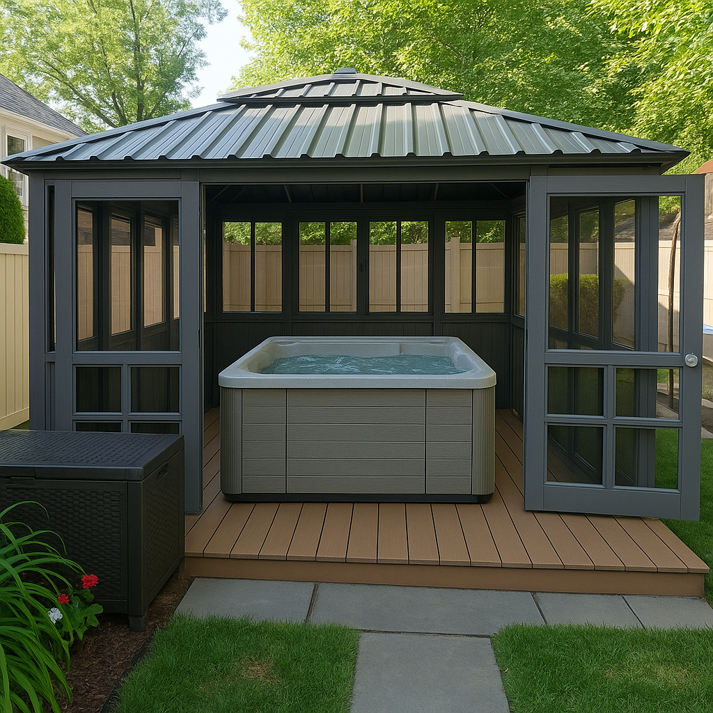 Upgrading your gazebo with sliding screens and tempered glass enhances comfort and safety. Sliding screens provide excellent ventilation and natural light while keeping insects and debris out. Tempered glass improves insulation, durability, and privacy. Together, these upgrades create an inviting, energy-efficient, and customizable space for an optimal hot tub experience.
