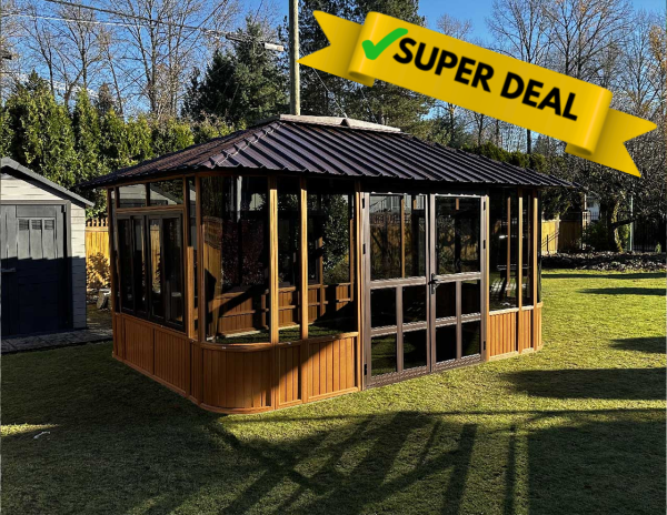 This designer-inspired hot tub enclosure includes a Duraflex PC roof with a skylight and lockable sliding windows made with aluminum frames and optional tempered glass. The entrance consists of 2 sizeable lockable swing French doors made of heavy-duty aluminum. Additional upgrades, including a screen kit and roof bracket support, are available for a fee. Multiple upgrades can be added together at a reduced cost.